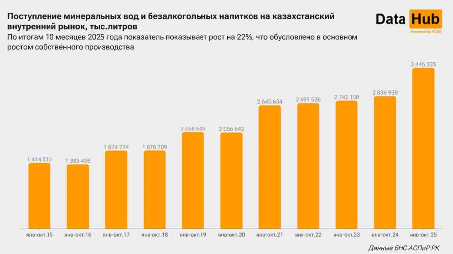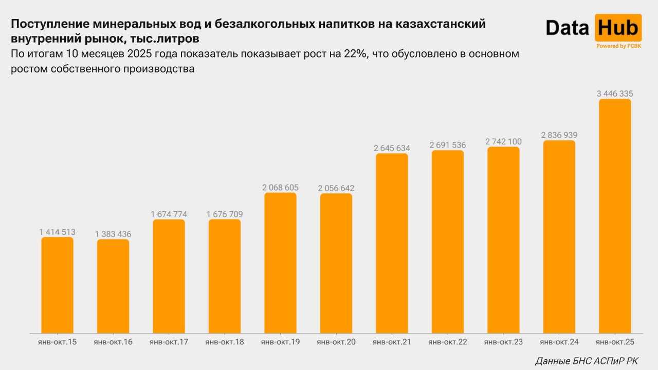 За январь–октябрь на внутренний рынок Казахстана поступило более 3,4 млрд литров минеральной воды и других безалкогольных напитков. Это на 22% больше по сравнению с аналогичным периодом прошлого года и является максимальным показателем как минимум за последнее десятилетие, передает kazlenta.kz со ссылкой на аналитический Telegram-канал DATA HUB.