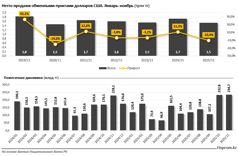 В течение первых девяти месяцев 2025 года ежемесячные объёмы нетто-продаж долларов колебались в пределах от 66,9 млрд до 175 млрд тенге. Однако осенью спрос заметно вырос: в октябре показатель увеличился до 232,8 млрд тенге, а в ноябре – до 234,7 млрд тенге, что стало максимальными значениями с начала года.