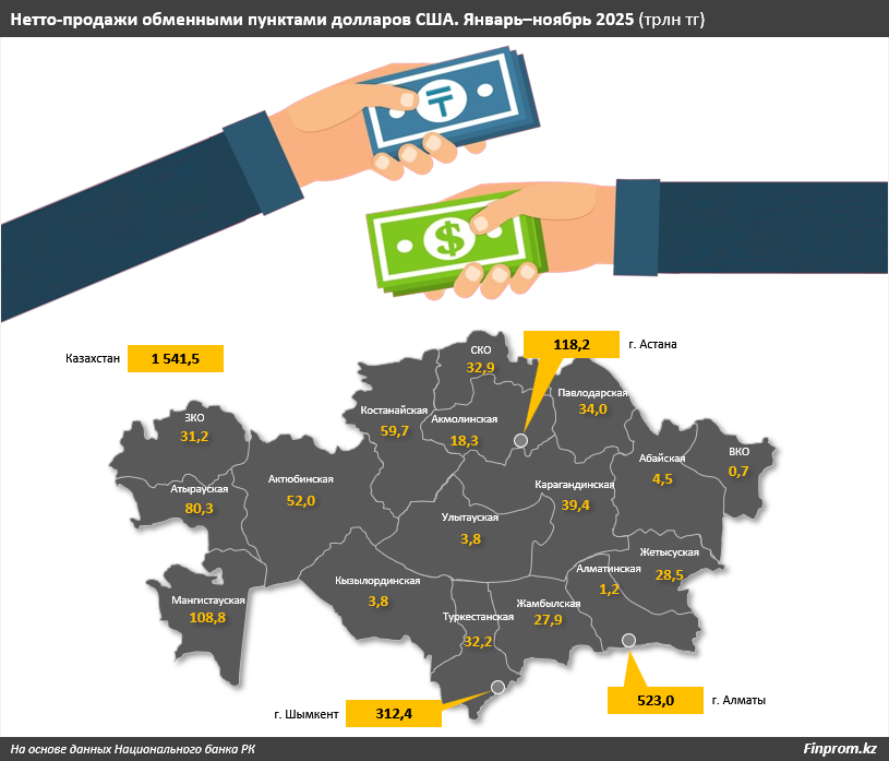 В региональном разрезе наибольшие объёмы нетто-продаж долларов за январь–ноябрь 2025 года пришлись на мегаполисы. Лидером стал Алматы с показателем 523 млрд тенге, за ним следуют Шымкент – 312,4 млрд тенге и Астана – 118,2 млрд тенге. При этом рост по сравнению с аналогичным периодом прошлого года был зафиксирован только в Алматы – на 13,4%. В Шымкенте объёмы сократились на 30,9%, в Астане – на 8,2%.