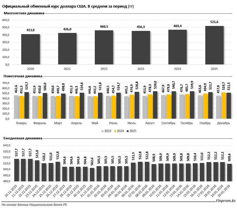 В начале 2026 года курс доллара демонстрирует умеренную волатильность. С начала января он вырос с 505,5 до 509,6 тенге к 20 января, колеблясь в течение месяца в диапазоне от 505,5 до 512,8 тенге.