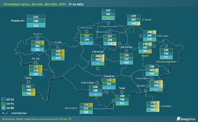 Самые низкие цены на бензин традиционно сохраняются на западе страны. Так, в декабре 2025 года литр АИ-92 стоил 219 тенге в Атырау, 223 тенге – в Уральске и 224 тенге – в Актобе. В Актобе также зафиксирована самая низкая цена на АИ-95 – 275 тенге за литр. Литр АИ-98 дешевле всего обходился в Актау – 296 тенге. Самые высокие цены наблюдались в Алматы, Жезказгане, Конаеве, Павлодаре и Семее.