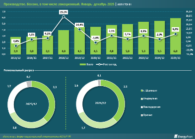 Объем реализации бензина на внутреннем рынке за год увеличился на 5,8% и за январь–ноябрь 2025 года достиг 5,2 млн тонн.