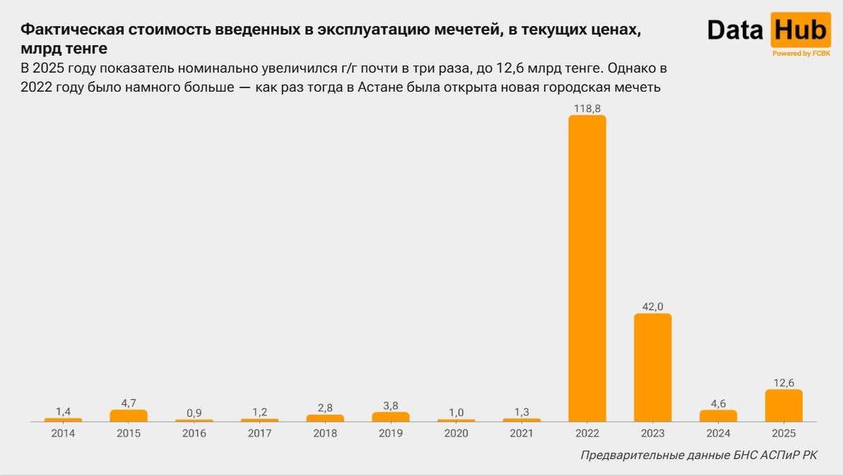 Так, в 2025 году совокупная стоимость введённых мечетей выросла почти в три раза по сравнению с предыдущим годом и составила 12,6 млрд тенге. Однако этот показатель остаётся значительно ниже рекорда 2022 года, когда объём инвестиций достиг 118,8 млрд тенге. Тогда 97% суммы пришлось на Астану – в столице была открыта главная городская мечеть, крупнейшая в Центральной Азии.