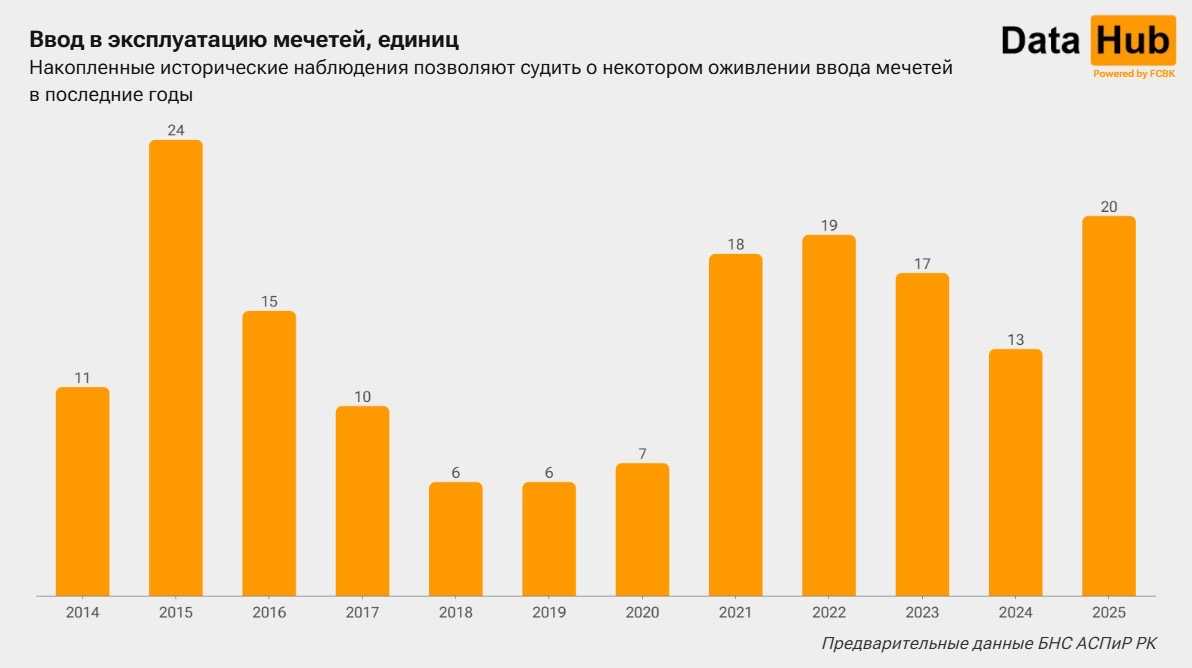 В Казахстане зафиксировано оживление темпов ввода мечетей. По итогам 2025 года в стране введено в эксплуатацию 20 мечетей, что на 54% больше, чем годом ранее. Об этом свидетельствуют данные Бюро национальной статистики Агентства по стратегическому планированию и реформам РК, передает kazlenta.kz со ссылкой на аналитический Telegram-канал DATA HUB.