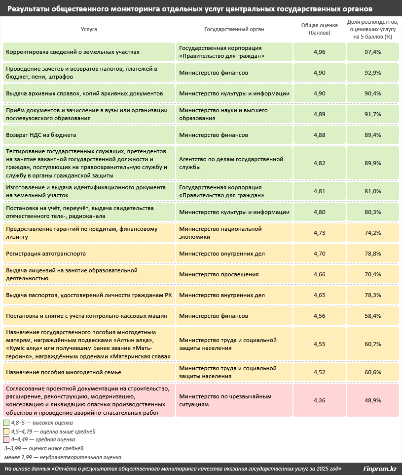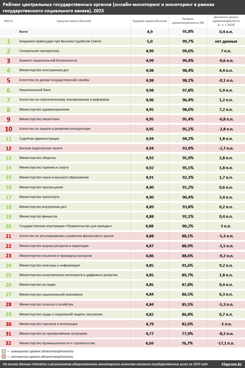 Всего в 2025 году 29 из 32 центральных госорганов получили очень высокие оценки – выше 4,8 балла. При этом Министерство промышленности и строительства РК, Министерство по чрезвычайным ситуациям РК и Министерство торговли и интеграции РК оказались в числе аутсайдеров рейтинга с показателями от 4,69 до 4,79 балла и уровнем удовлетворённости от 77% до 83%.