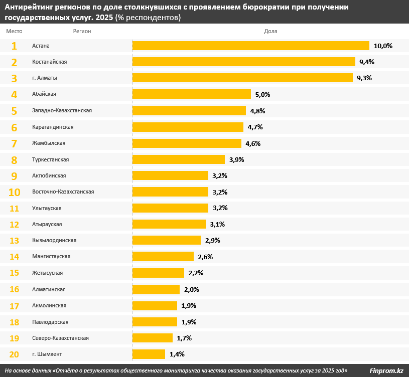 Большинство регионов попали в категорию с низкой распространённостью бюрократии. Менее 5% респондентов заявили о проволочках при оформлении документов в Абайской и Западно-Казахстанской областях. Самые низкие показатели зафиксированы в Шымкенте (1,4%), а также в Северо-Казахстанской (1,7%), Акмолинской и Павлодарской (по 1,9%) областях.