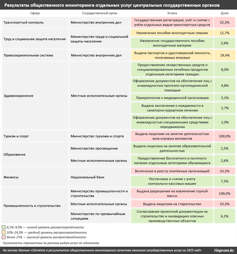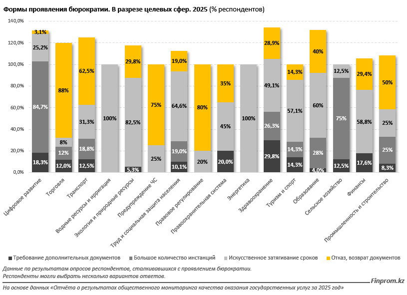 Существенные различия отмечены и между другими сферами. В сельском хозяйстве не фиксировались отказы, однако 75% респондентов указали на необходимость обращения в большое количество инстанций, что может быть связано с децентрализацией услуг. В финансовой сфере преобладали затягивание сроков (58,8%) и отказы (29,4%). Речь идёт, в частности, об услугах Национального банка РК по включению в реестр платёжных организаций и услугах подведомственных структур Министерства финансов РК при постановке на учёт контрольно-кассовых машин.