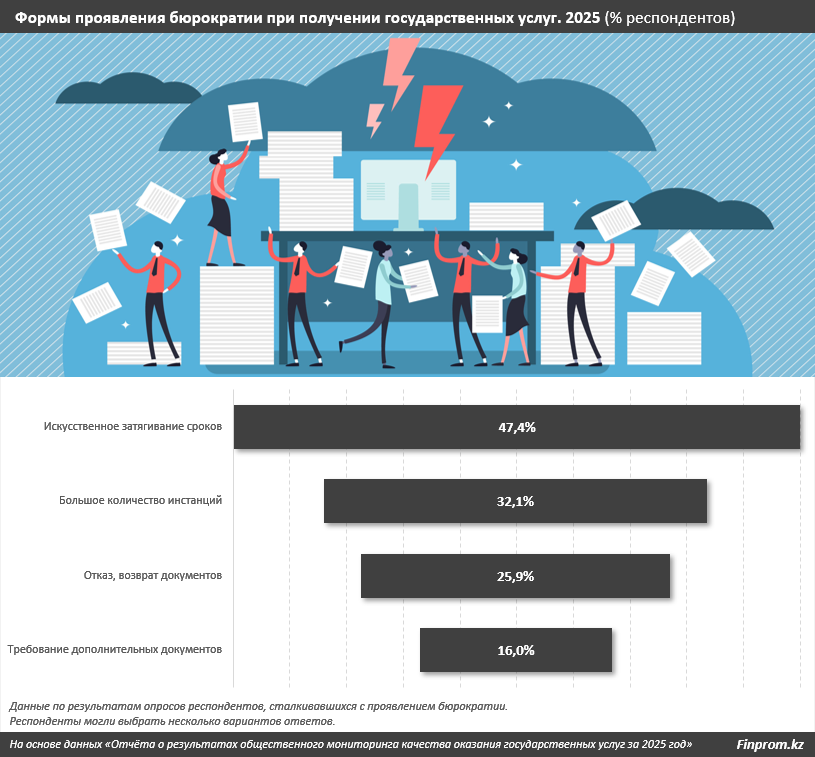 Самой распространённой формой бюрократии остаётся искусственное затягивание сроков – с этой проблемой столкнулись 47,4% всех респондентов, имевших дело с проволочками в госорганах. На втором месте – необходимость обращения в большое количество инстанций для сбора документов, о чём сообщили 32,1% опрошенных. Бюрократией также называли отказы в предоставлении услуг или возврат документов – на это указали 25,9% респондентов. При этом авторы исследования не уточняют, были ли такие отказы юридически обоснованными. Реже всего – в 16% случаев – респонденты сталкивались с требованием предоставить дополнительные документы уже в процессе оказания услуги. Отмечается, что исследование отражает субъективное восприятие граждан.