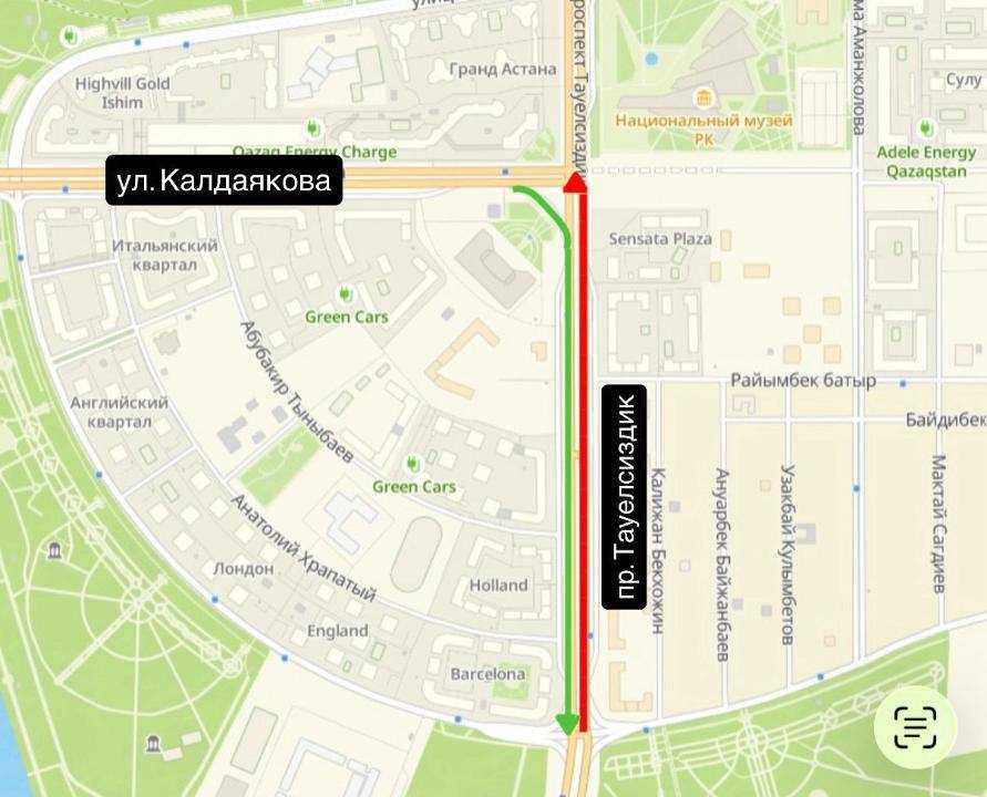 Ограничения действуют на участке от улицы Ш. Калдаякова до улицы И. Панфилова в одном направлении. При этом для автомобилистов сохранён дополнительный заезд на проспект Тәуелсіздік с правым поворотом от улицы Ш. Калдаякова.