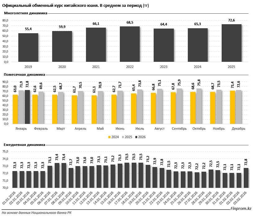 В январе текущего года средний курс юаня сложился на уровне 72,8 тенге – на 0,3% выше по сравнению с предыдущим месяцем и на 1,3% выше, чем в январе 2025 года. Второй месяц года юань начал с отметки 72,1 тенге, а к 3 февраля подорожал на 0,9%, до 72,8 тенге. С начала года курс китайской валюты вырос на 0,6%: на 1 января 2026 года он составлял 72,3 тенге.