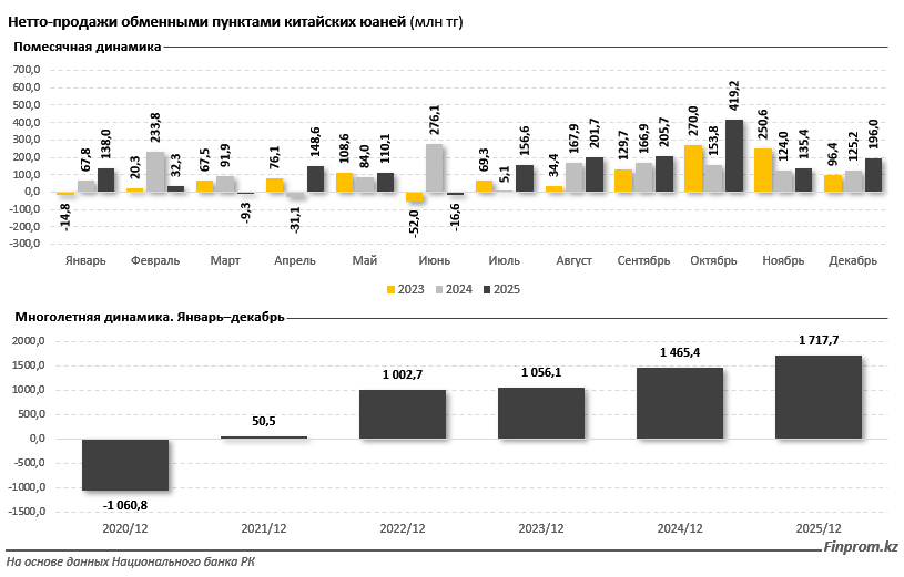 По итогам января–декабря прошлого года объём нетто-продаж юаней достиг 1,7 млрд тенге, что на 17,2% больше по сравнению с аналогичным периодом 2024 года. «Чистые» продажи китайской валюты растут уже пятый год подряд и четыре года кряду превышают отметку в 1 млрд тенге в год.
