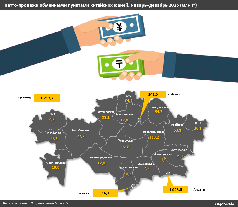 Положительные объёмы нетто-продаж юаней в 2025 году зафиксированы в 17 из 20 регионов страны. Более 1 млрд тенге пришлось на Алматы. Значительно меньшие объёмы показали Астана и Карагандинская область – 141,5 млн и 138,2 млн тенге соответственно.