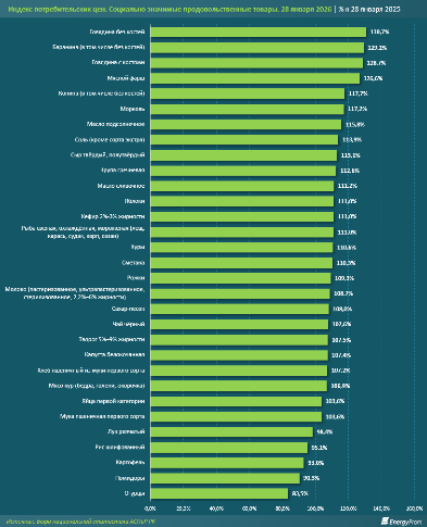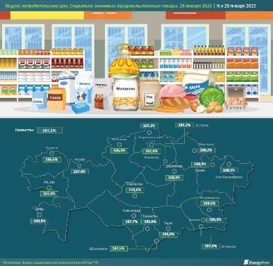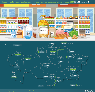 Средние цены на социально значимые продовольственные товары в Казахстане по состоянию на 28 января 2026 года выросли на 7,1% в годовом выражении. С начала года рост составил 0,3%. Перечень СЗПТ, утверждённый приказом министра торговли и интеграции РК от 23 декабря 2025 года, включает 31 наименование продуктов питания, передает kazlenta.kz со ссылкой на energyprom.kz.