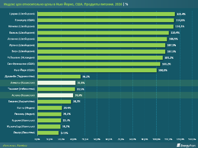 В Астане цены на продукты питания ниже нью-йоркских на 70,1%, в Алматы – на 68,1%. Ташкент занял промежуточное положение с индексом 31,5%, что означает цены на 68,5% ниже, чем в Нью-Йорке. Единственной страной Центральной Азии, не представленной в рейтинге Numbeo, стал Туркменистан.