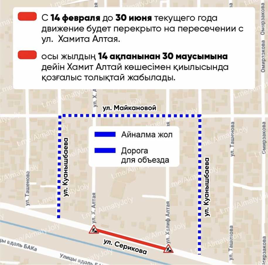 По информации пресс-службы акимата, с 14 февраля по 30 июня движение будет полностью перекрыто на пересечении улицы Серикова с улицей Хамита Алтая.