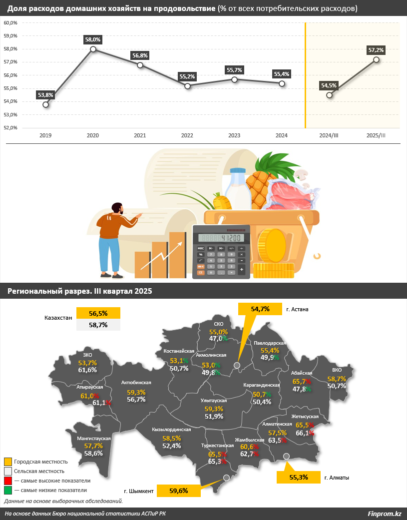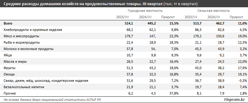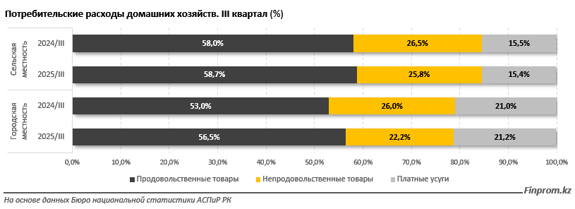 Разница между городом и селом также остаётся заметной. В третьем квартале прошлого года в сельской местности доля расходов на продукты составляла 58,7%, в городах – 56,5%. В отдельных регионах в аулах показатель доходил до 66,1%, что отражает более низкий уровень доходов сельских семей.