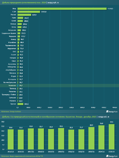 По данным Energy Institute, по итогам 2024 года Казахстан занял 25-е место в мире по добыче природного газа с объёмом 29,7 млрд кубометров. Общемировая добыча составила 4,1 трлн кубометров. Лидерами стали США (1 трлн кубометров), Россия (629,9 млрд), Иран (262,9 млрд) и Китай (248,4 млрд), на которые пришлось более половины мирового объёма. Доля Казахстана – около 0,7%.