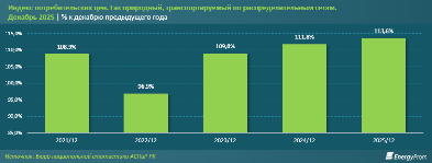 Ценовая динамика усиливает нагрузку на потребителей. По итогам декабря прошлого года природный газ, транспортируемый по распределительным сетям, подорожал на 13,6% к декабрю 2024-го. Годом ранее рост составлял 11,8%, в декабре 2023 года — 9%, а в 2022-м цены снижались на 3,1%. Таким образом, ускорение роста тарифов для населения наблюдается второй год подряд.
