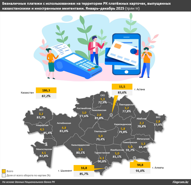 В региональном разрезе лидером по уровню безналичных расчётов в 2025 году стала Алматинская область: доля «безнала» здесь достигла 91,7%, а объём – 5,9 трлн тенге. Далее следуют Алматы с показателем 91% и Туркестанская область – 90,8%.
