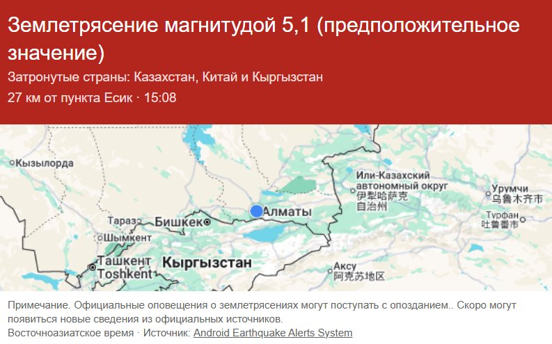 Землетрясение магнитудой 5,1 (предположительное значение). Затронутые страны: Казахстан, Китай и Кыргызстан 27 км от пункта Есик · 15:08.