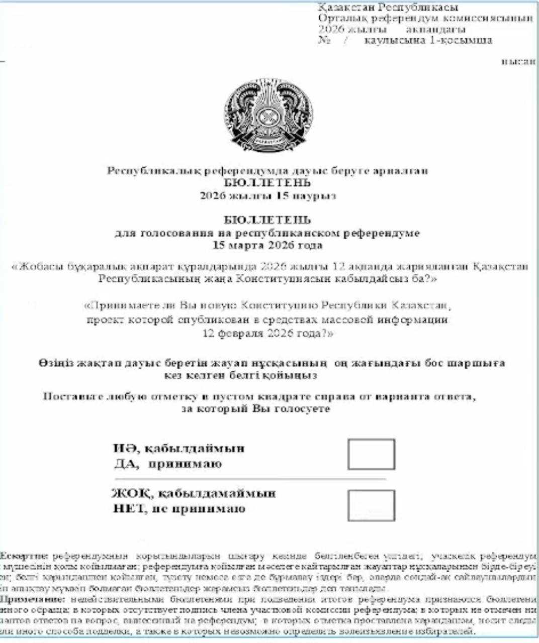 Формулировка вынесенного вопроса: «Принимаете ли вы новую Конституцию Республики Казахстан, проект которой опубликован в средствах массовой информации 12 февраля 2026 года?» Варианты ответа: «Да, принимаю» и «Нет, не принимаю», – сообщил он.