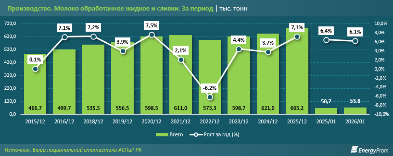 Положительная динамика сохраняется и в начале 2026 года. В январе было произведено 53,8 тыс. тонн молока и сливок – на 6,1% больше, чем в январе прошлого года. Для сравнения, в январе 2025-го рост составлял 6,4%.