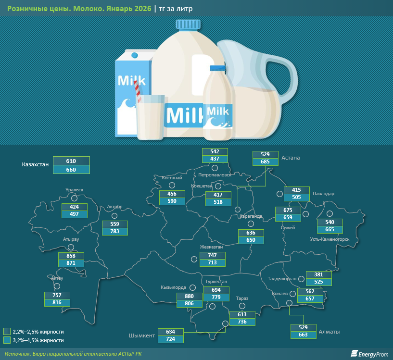Розничные цены заметно различаются по регионам. В январе 2026 года средняя цена по стране составила 610 тенге за литр молока жирностью 2,2%–2,5% и 660 тенге – для 3,2%–4,5%.
