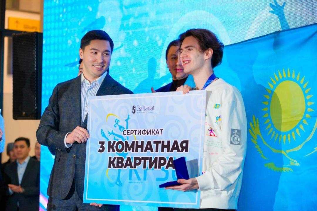 От имени Казахстанского союза фигурного катания на коньках при поддержке спонсора Михаилу Шайдорову и его тренеру Алексею Урманову вручили ключи от трехкомнатных квартир, Софье Самоделкиной и Асем Касановой – от однокомнатных.