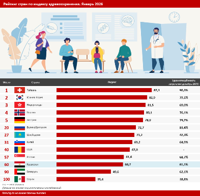 Так, в январе 2026 года лидеры рейтинга демонстрировали высокую удовлетворённость расходами на медицину. В Тайване этот показатель составил 90,3%, в Южной Корее – 79,1%. Исключением стала Швейцария: при одном из самых высоких уровней медицины удовлетворённость стоимостью услуг там составила лишь 42,3%.