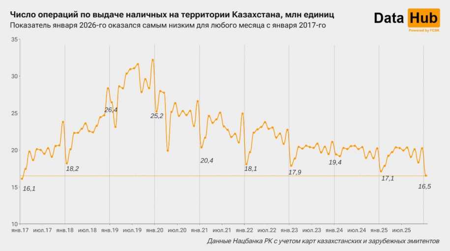 В январе 2026 года в Казахстане зафиксировали 16,5 млн операций по снятию наличных с использованием банковских карт – как казахстанских, так и зарубежных эмитентов. Такие данные приводит Национальный банк РК, передает kazlenta.kz со ссылкой на аналитический Telegram-канал DATA HUB.