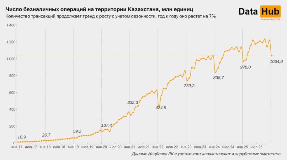 Сейчас разрыв между этими показателями стал особенно заметным. В январе 2026 года общее число безналичных операций превысило 1 млрд, показав рост на 7% в годовом выражении. В денежном выражении динамика скромнее: номинальный объем увеличился на 6%, до 13,4 трлн тенге, однако с учетом инфляции показатель снизился на те же 6%.
