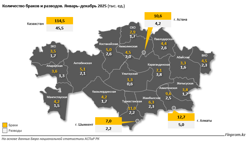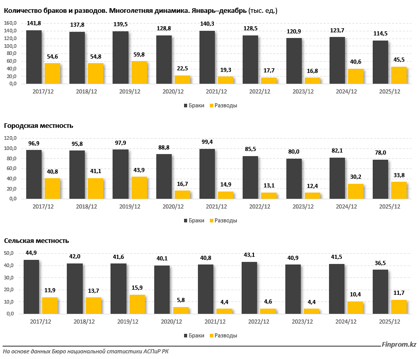 Основная брачная активность по-прежнему сосредоточена в городах. В 2025 году там зарегистрировано 78 тыс. браков (68,1% от общего числа по стране). При этом в городах же фиксируется и больше разводов – 33,8 тыс., против 11,7 тыс. в сельской местности.