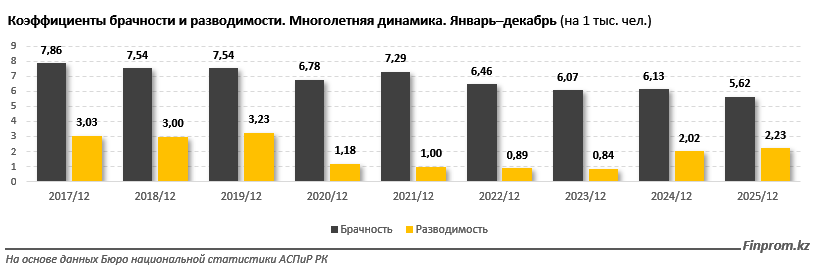 В 2025 году в Казахстане продолжилось снижение брачной активности на фоне роста числа разводов, передает kazlenta.kz со ссылкой на finprom.kz.