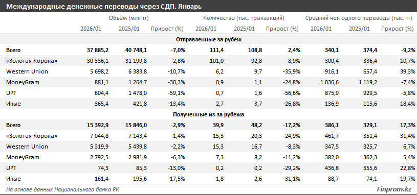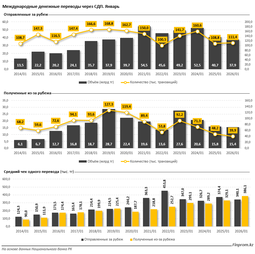 Несмотря на снижение объёма, количество переводов выросло. В январе было совершено 111,4 тыс. транзакций, что на 2,4% больше, чем годом ранее. Однако средний чек одного перевода сократился на 9,2% и составил 340,1 тыс. тенге.
