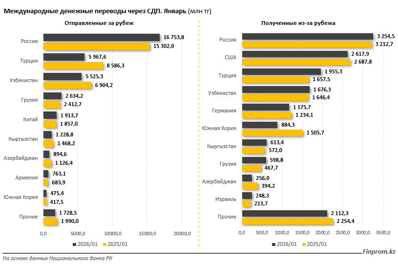 В январе объём переводов в РФ вырос на 9,5% и достиг 16,8 млрд тенге. Доля России увеличилась с 37,6% до 44,2%.