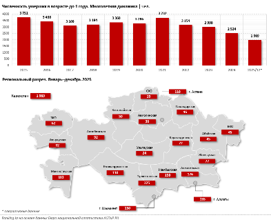 После всплеска в 2021 году, когда показатель достиг 3,7 тыс. случаев на фоне пандемии COVID-19, динамика снова начала улучшаться. По итогам 2025 года количество умерших детей до одного года снизилось на 24,2% по сравнению с 2024 годом.