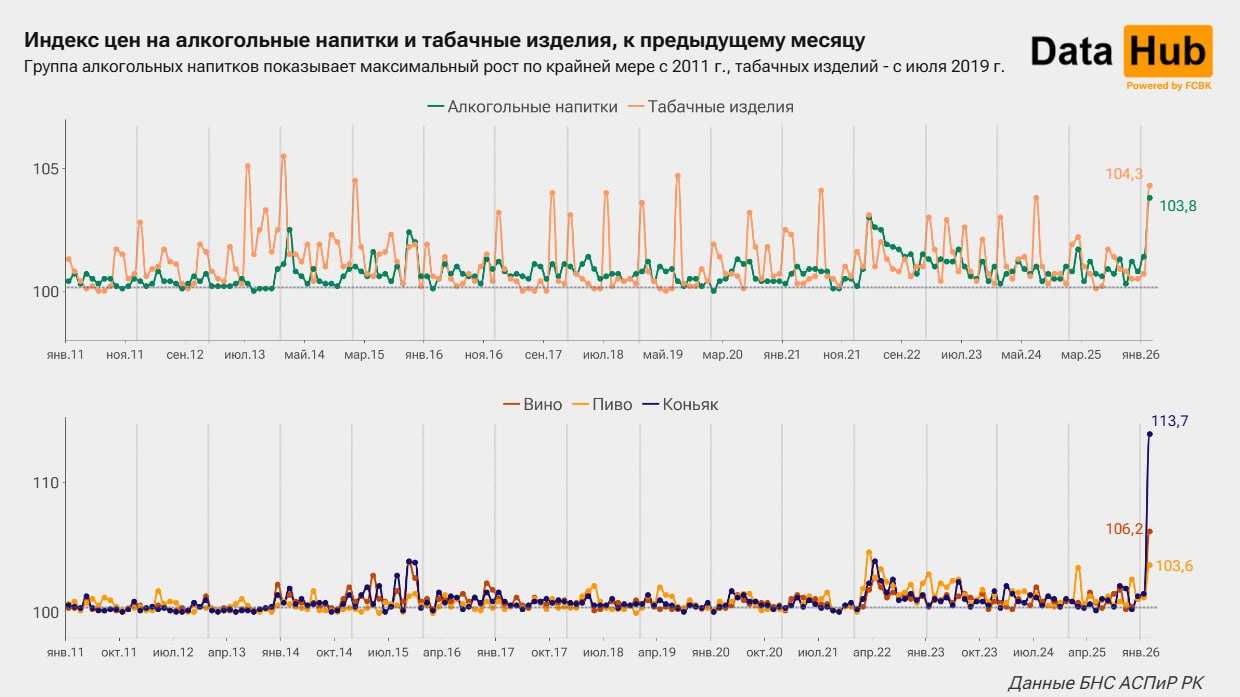 В феврале цены по категории «Алкогольные напитки и табачные изделия» выросли в среднем по Казахстану на 4,1% к январю. Это самый заметный месячный рост для этой группы товаров как минимум с начала 2011 года, передает kazlenta.kz со ссылкой на аналитический Telegram-канал DATA HUB.