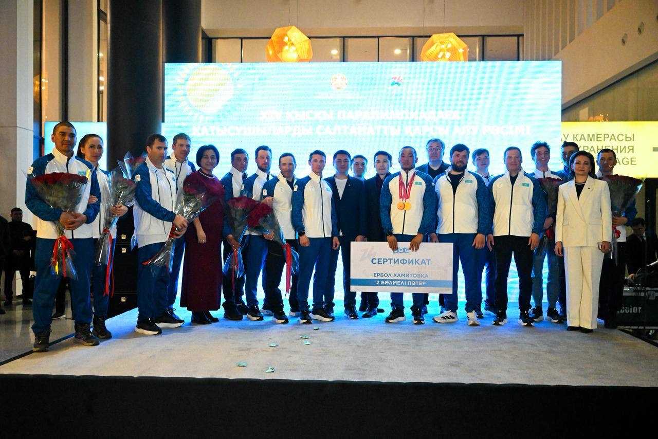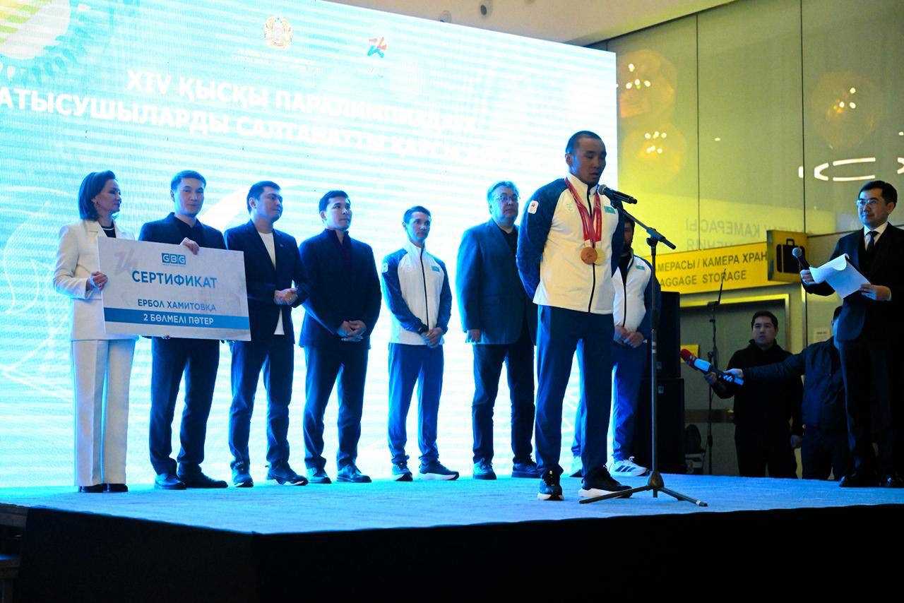 Спортсмена встретили болельщики, родные, а также представители спорсообщества. Ербола Хамитова и спортсменов национальной сборной поздравили министр туризма и спорта Ербол Мырзабосынов, председатель национального паралимпийского комитета Бахыт Сапаров.