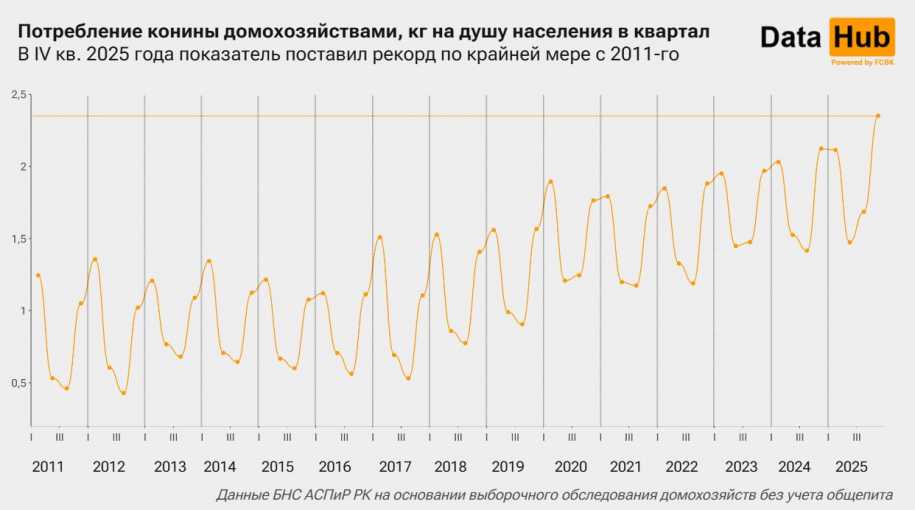 По итогам IV квартала средний казахстанец съел 2,35 кг конины, что стало максимальным показателем для любого квартала за последние 15 лет, передает kazlenta.kz со ссылкой на аналитический Telegram-канал DATA HUB.