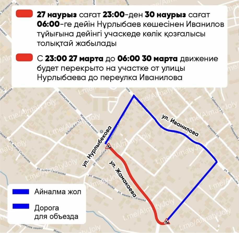 По информации пресс-службы городского акимата, проезд будет закрыт с 23:00 ч. 27 марта до 06:00 ч. 30 марта на участке от улицы Нурлыбаева до переулка Иванилова.