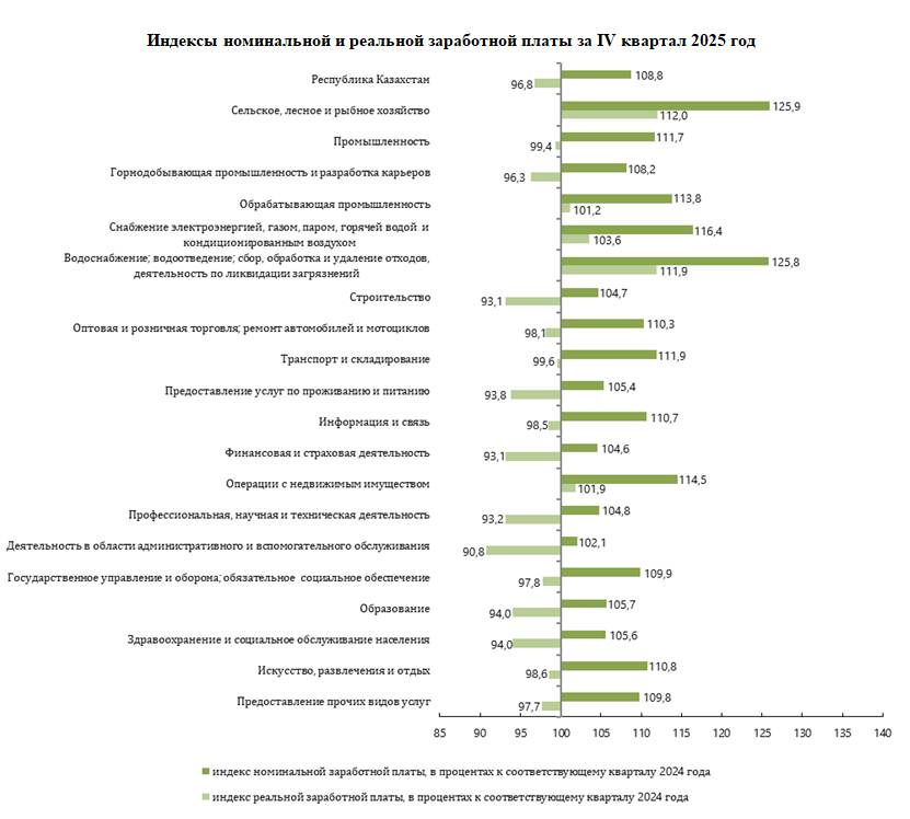 По информации Бюро национальной статистики, среднемесячная номинальная зарплата (без учета малых предприятий) достигла 473 158 тенге. По сравнению с аналогичным периодом 2024 года индекс номинальной зарплаты вырос до 108,8%, однако в реальном выражении показатель составил 96,8%.