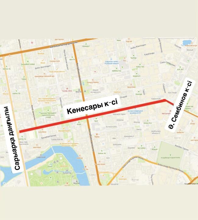 Одновременно с этим будут начаты работы по среднему ремонту дорожного полотна ул.Кенесары от ул. А. Сембинова до пр.Сарыарка (При этом по ул. Кенесары в 2025 году работы проводились на участке от ул. Е. Брусиловского до А. Сембинова). Работы будут проводиться в период с 5 по 20 апреля. При этом движение будет перекрываться поэтапно.