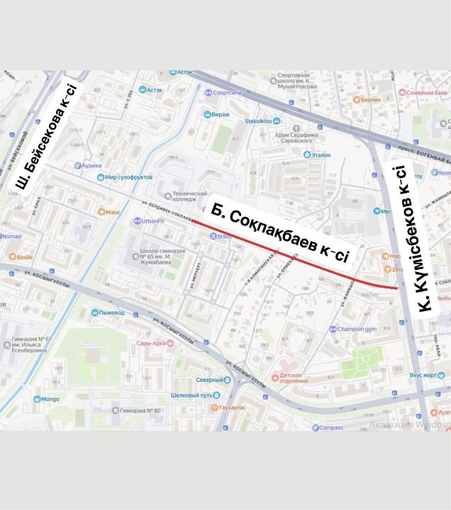 - будет продолжено строительство улицы Б. Сокпакбаева на участке от ул. Ш. Бейсековой до ул. К. Кумисбекова. Движение на данном участке будет полностью перекрыто в период с 5 апреля по ноябрь текущего года.