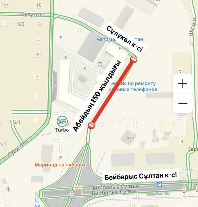 - начнется реализация проекта «Строительство ул. 150 лет Абая на участке от пр. Тлендиева до ул. Бейбарыс Султан». В рамках проекта участок от ул. Бейбарыс Султан до ул. Сулуколь будет полностью закрыт для движения с 5 апреля по 10 октября текущего года.