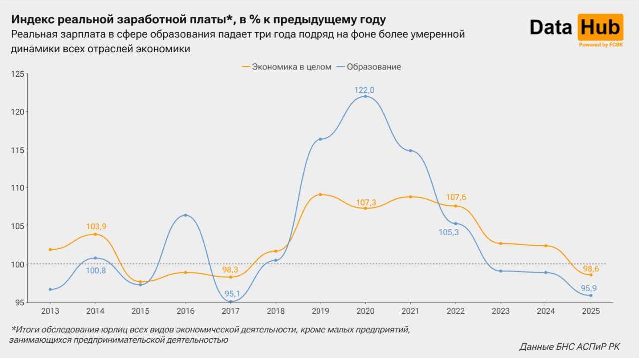 В 2025 году среднемесячная заработная плата работников образования составила 322,7 тыс. тенге, увеличившись на 6,8% по сравнению с предыдущим годом. Однако этот рост полностью нивелируется инфляцией: в реальном выражении зафиксировано снижение на 4,1%. Такие данные приводит БНС АСПиР РК по итогам сплошного обследования предприятий (за исключением малого бизнеса), передает kazlenta.kz со ссылкой на аналитический Telegram-канал DATA HUB.