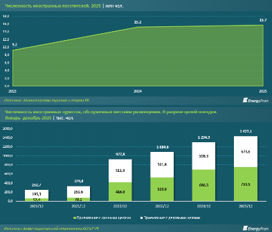Казахстан продолжает наращивать туристическую привлекательность. По итогам 2025 года страну посетили 15,7 млн иностранных гостей, что на 71% больше, чем годом ранее, передает kazlenta.kz со ссылкой на energyprom.kz.
