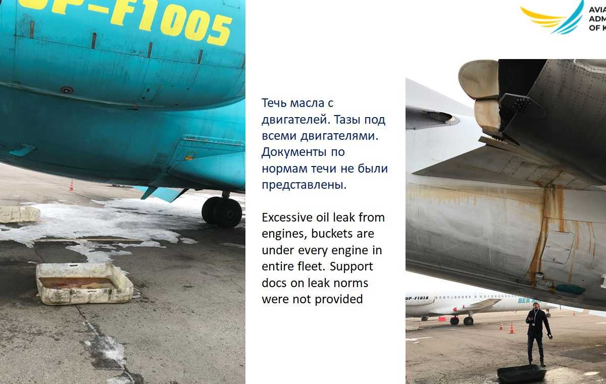 И на фото вы видите течь масла, я как пилот не хотела бы видеть это на пилотируемом судне. Важно зафиксировать факт протечки, чтобы можно было отслеживать ситуацию и предпринимать действия. У Bek Air нет реестров, в которых были зарегистрированы утечки масла. И эти протечки были настолько обширны, что эксперты обнаруживали тазы под каждым судном, и это не нормально. И опять таки, не было каких-либо документов, зафиксировавших утечку, - продолжила спикер.