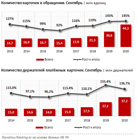 В последние годы как во всём мире, так и непосредственно в Казахстане наблюдается тенденция роста рынка электронной коммерции и, соответственно, количества безналичных платежей. Пандемия коронавируса COVID-19 заметно ускорила процесс перехода на безналичные платежи, повсеместное использование платёжных карт и развитие электронной торговли. Так, к октябрю текущего года в обращении находилось 44,3 млн платёжных карт — сразу на 45% больше, чем в аналогичном периоде 2019 года (30,6 млн платёжных карт). Подобный рост — максимальный за последние годы. Наиболее распространены дебетовые карточки, их доля составляет 76,5%, доля кредитных карт — 20,0%, сообщает kazlenta.kz со ссылкой на ranking.kz.