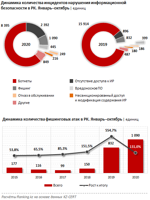 Кроме того, наблюдается рост в сфере наиболее опасных видов кибератак. Одним из самых распространённых в мире видов киберпреступлений, с помощью которых чаще всего похищают аккаунты и банковскую информацию, является фишинг. Это вид компьютерного мошенничества, основная цель которого — обманным путем вынудить жертву предоставить мошеннику нужную ему информацию. Фишинг преследуется по закону. Из-за активного развития рынка платёжных карт и, соответственно, роста количества безналичных платежей наибольшее число фишинговых атак за всю историю было зафиксировано за последние два года. Так, по итогам десяти месяцев 2020 года в РК было выявлено 1090 фишинговых атак, в аналогичном периоде прошлого года — 832 атаки. При этом за соответствующий период 2018 года было зафиксировано всего 150 атак, 2017-го — 99 атак, 2016-го — 116 атак.