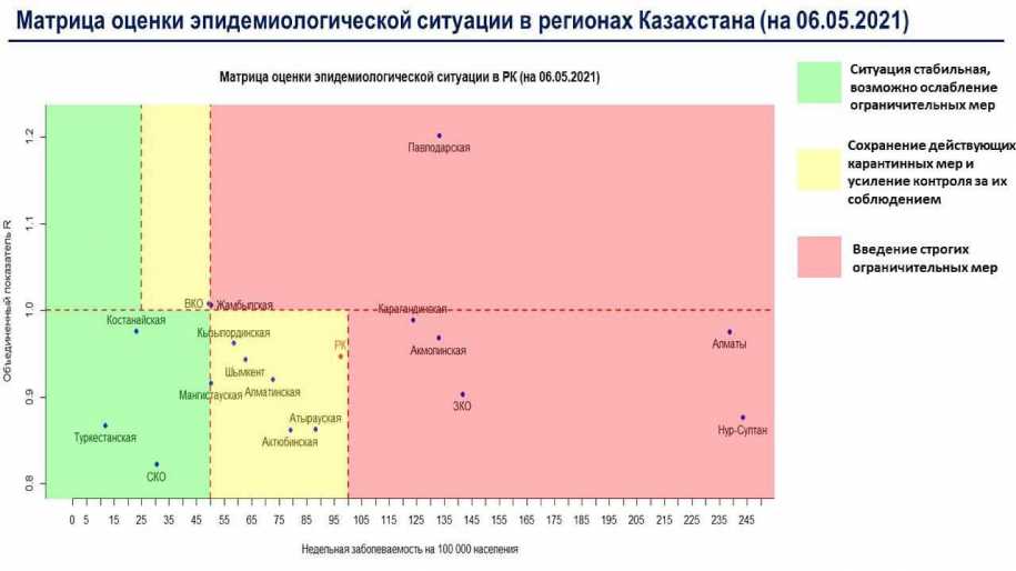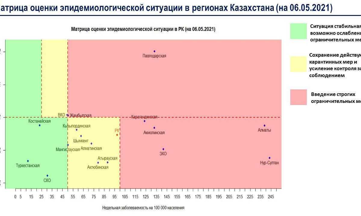 В «красной» зоне: гг. Нур-Султан, Алматы, Акмолинская, Жамбылская, Западно-Казахстанская, Карагандинская, Павлодарская области.